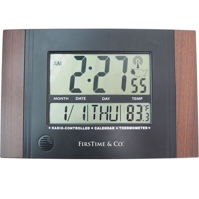 Description The Executive Digital Clock by FirsTime® makes a great addition to any desk or office wall, with its rich faux woodgrain accents and technology. It features a digital time, date and temperature display, as well as an alarm function. This convenient clock is radio-controlled and automatically adjusts for Daylight Savings Time. Rich Faux Woodgrain Accents Automatically adjusts for Daylight Savings Time Digital Time, Date and Temperature Display Alarm Function Perfect Tabletop Size Specifications Weight (lbs.) : .90 Clock & Timer Type : Table Clock Material of Item : Plastic Height in Inches : 7.5 Width in Inches : 11 Depth in Inches : 2 Indoor or Outdoor Use : Indoor Clock Style : Traditional Clock Case Material : Plastic Clock Case Color : Black Clock Face Color : Black Mechanism Power : Quartz Clock Battery Type : AA Clock Number Type : Arabic/Standard Clock Theme : None Brand : FirsTime Customizable : No Weight : 0.70 lbs. per Each