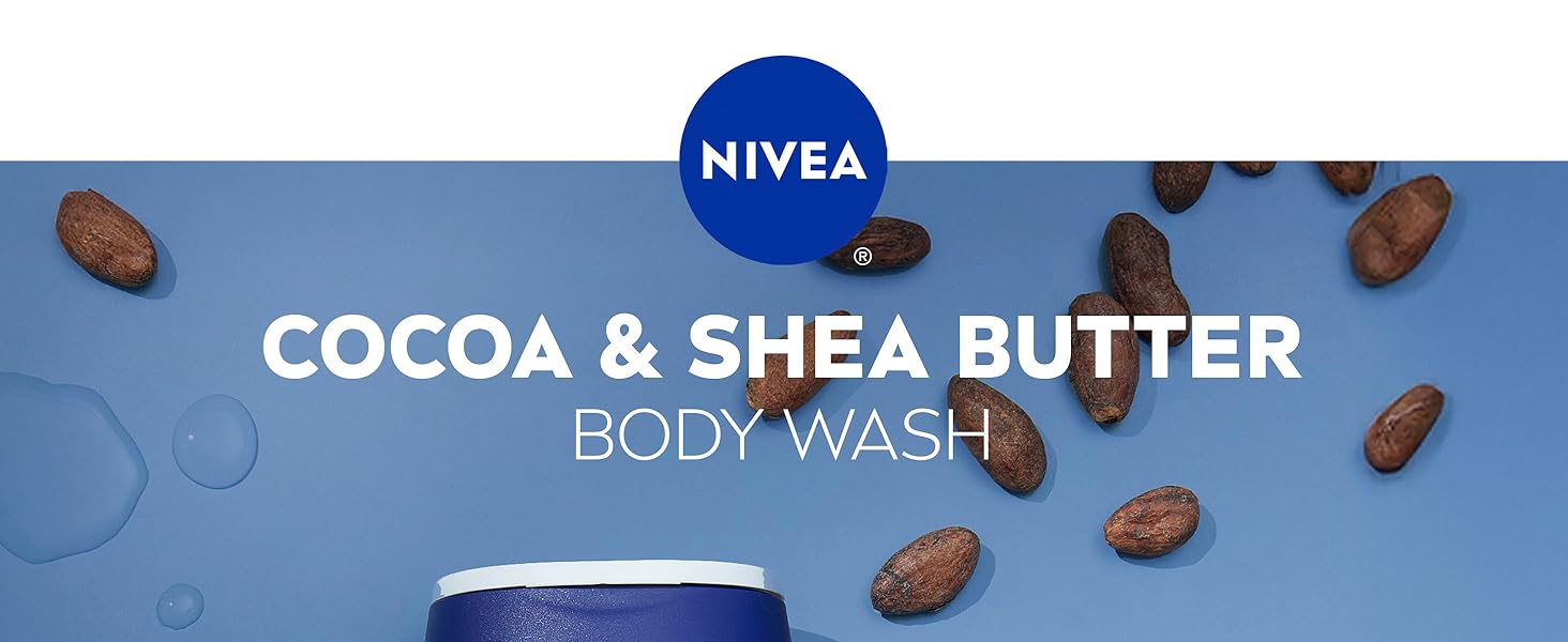NIVEA Pampering Cocoa and Shea Butter Body Wash is a 20 fl oz moisturizing formula enriched with nourishing serum, Provitamin B5, and Vitamin E. It offers long-lasting hydration with a gentle, microbiome-friendly cleanse, featuring 88% naturally derived ingredients and sustainable packaging made from 50% recycled plastic.