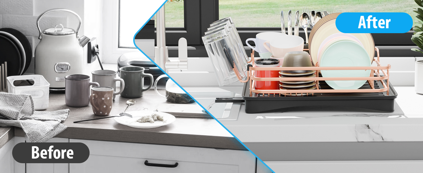 This black aluminium dish drying rack by BRIAN & DANY is well-built and looks great on the worktop with its sleek black finish. The aluminium frame feels sturdy and is also resistant to rust, whilst the removable cutlery and cup holders are very handy features. The 360° swivel spout for drainage is a great feature as it makes it easy to adjust and ensures water flows directly into the sink, keeping the counter dry.However, for me this has one major flaw which made me return it. Even though I returned the product, I thought it necessary to do the review to outline how good this product really is and what I saw as a flaw, someone may think of it as a benefit and wish to keep the product. I just felt that the raised section designed for plates takes up a significant amount of space even when it’s not in use. The dish rack I was looking to replace this with has a small A shaped bit (without the cross section of the A) that sits in the middle of the plates, and there is nothing raised either side, leaving more room for additional cutlery either side to the plates. The problem with this design is that for each plate they have a raised section, whereby the raised bits cover the entire width of the plates, with two upside down U shapes at each end of the raised bits that support the plates. Whilst this design supports the plates better, it just takes up too much space, as that whole raised section is still there when the plates are not inside it and the space around the raised section is still more or less unusable. This obviously limits the available space for dying other things, like bowls, cups, cutlery, etcOverall I would say this is an excellent choice for smaller households where you may not need as much space or you don't have as many flat plates. If the raised section had a more flexible or collapsible design, it would have been much more versatile and I would have kept it as I liked everything else about this, and that includes the price.