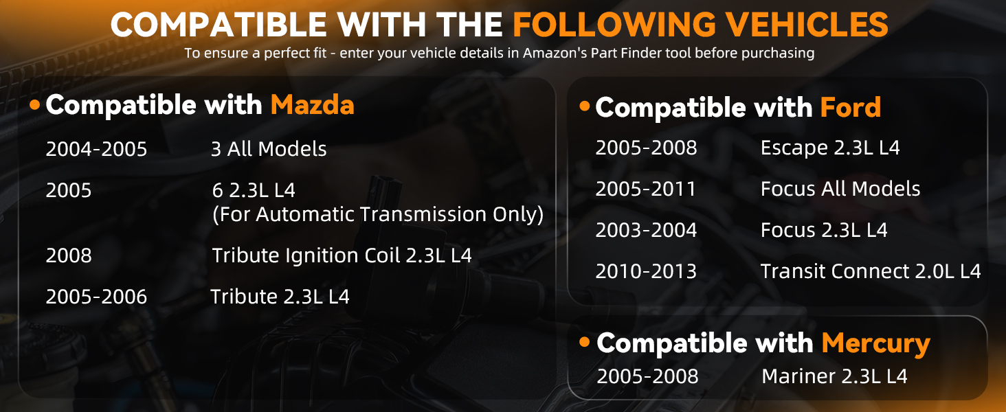 The DEAL Ignition Coil Pack is a premium 4-piece set engineered with precision copper wire for enhanced ignition efficiency and durability. Designed as a direct OE replacement, it fits a wide range of 2.0L and 2.3L L4 engines from Ford, Mazda, and Mercury models, ensuring seamless installation and reliable spark performance. Backed by a 2-year unlimited mileage warranty, this coil pack delivers improved fuel economy, smoother engine operation, and long-lasting performance.
