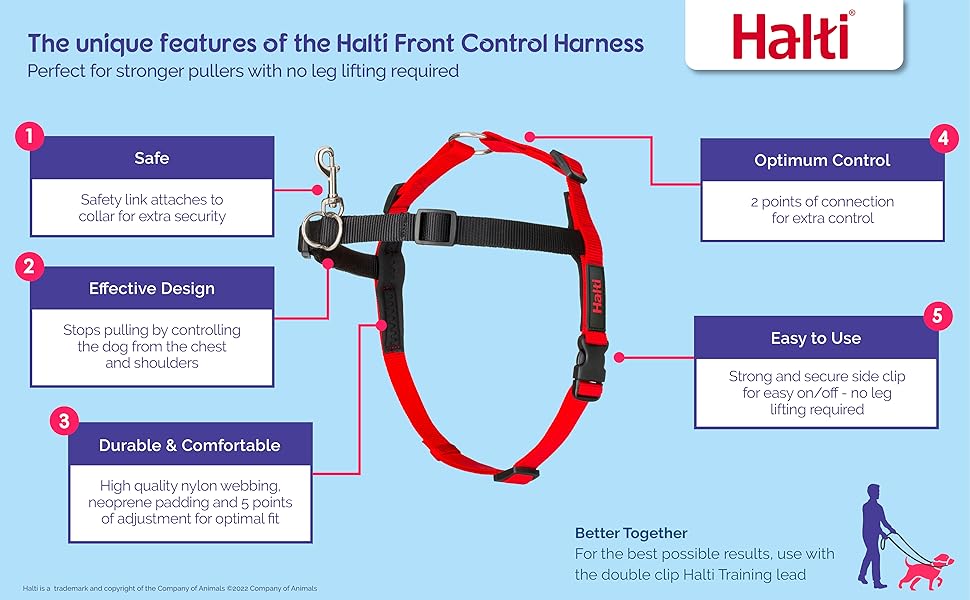 The Company of Animals Halti Front Control Dog Harness is designed specifically for small dogs, providing a humane and effective solution to stop pulling during walks. With adjustable features, neoprene padding for comfort, and a safety clip for security, this harness is perfect for daily use and behavioral training.