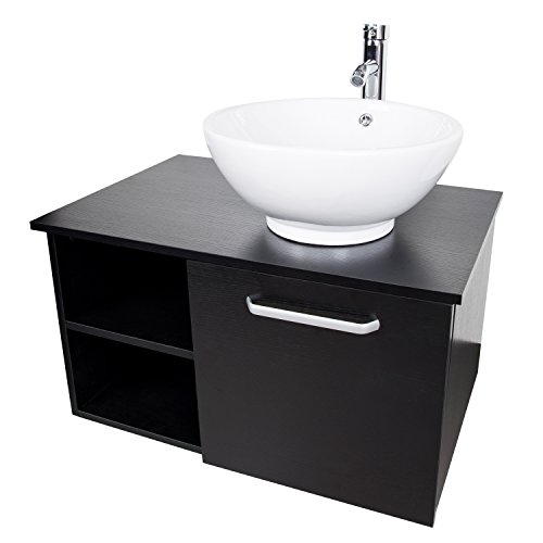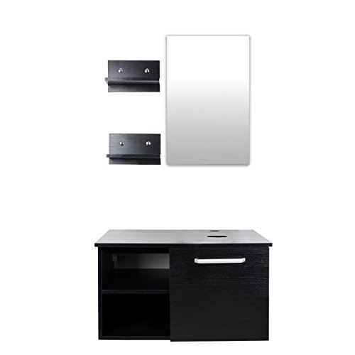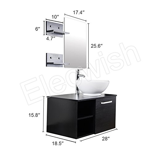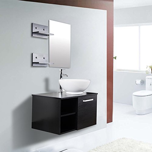 Features: - Modern and stylish design fit perfectly with most bathroom décor; - Wooden counter top and storage that coated in glossy black finish; - Satin Nickel Hardware Outfits are included; - All mounting hardware and wall mounted mirror included; - Designed for above counter installation; - Excellent Covering, Easy to assemble; Specification: - Max. Capacity: 220 lbs - Wood cabinet size: 28" L x 18.5'' W x 15.7'' H - Mirror size: 25.6'' H x 17.3" W Suggestion: Mounting Ring is to be placed beneath the panel board when assembling Glass Vessel Sink Combo, Ceramic Not required.