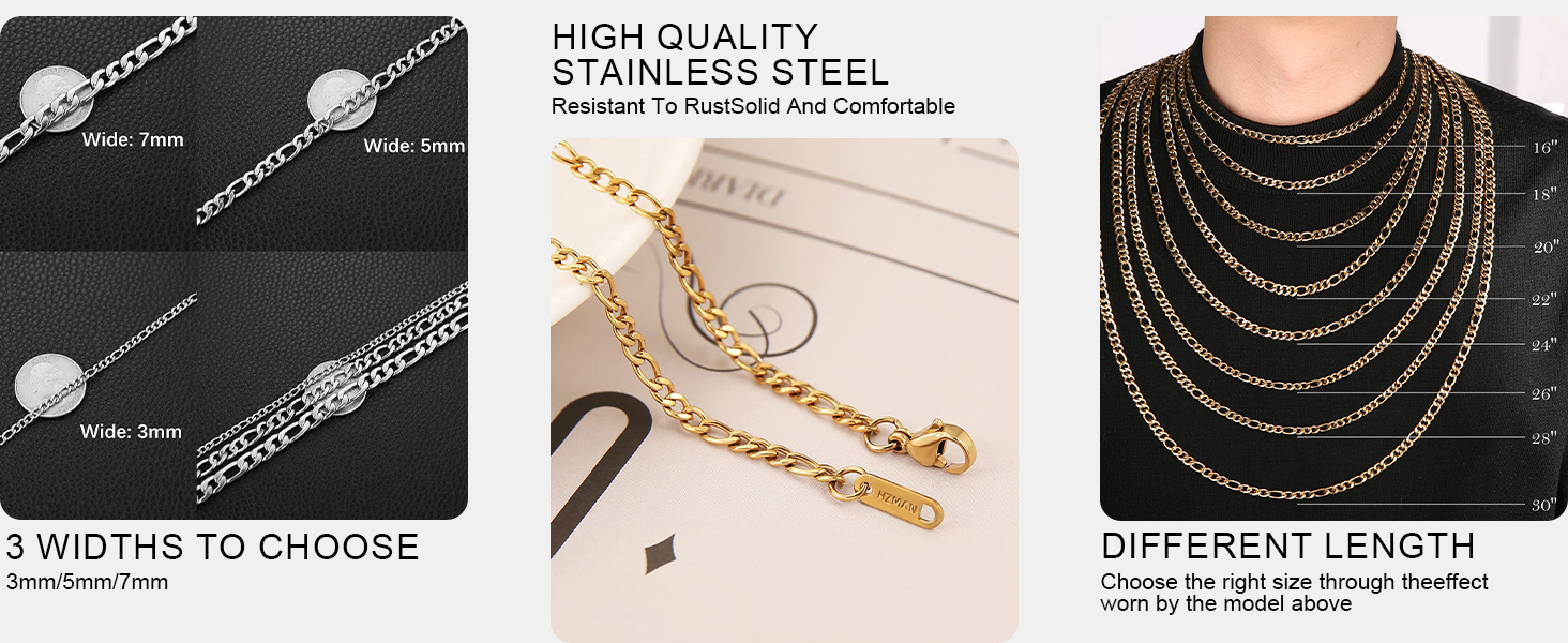 Elevate your jewelry collection with our exquisite figaro chain necklace, expertly crafted from premium stainless steel for maximum durability and a timeless appeal. Available in lengths ranging from 16 inches to 30 inches, this chain is perfect for layering or wearing alone, making it a versatile addition to any wardrobe.The figaro design features a distinctive pattern of alternating short and long links, adding a dynamic touch to your look. Choose from a range of widths—3mm, 5mm, and 7mm—available in classic silver and opulent gold finishes, allowing you to express your personal style.Whether you are seeking the perfect gift for a loved one or a special treat for yourself, this figaro chain necklace is an ideal choice. Its elegant design is suitable for any occasion, from casual outings to formal events. Make a statement with this stunning piece of jewelry that combines quality craftsmanship with contemporary style.