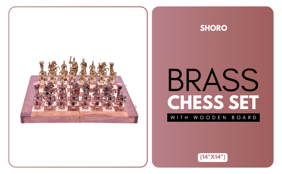 The SHORO Brass Chess Set features a 14x14 inch Sheesham wood board paired with finely crafted brass chess pieces up to 3.5 inches tall. Made in India, this set combines traditional craftsmanship from Aligarh and Saharanpur, designed for 1-2 players aged 4 and above. Ready to play out of the box, it offers a premium, tactile chess experience that blends heritage with modern elegance.