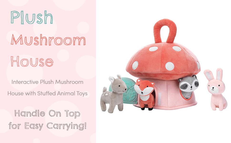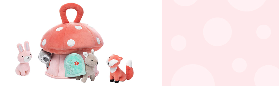 The Lambs & Ivy Interactive Plush Mushroom House is a compact, machine-washable polyester playset featuring a velour handle and four adorable woodland animal plush toys. Designed for toddlers and babies, it encourages imaginative play with peek-a-boo windows and makes a perfect gift for baby showers or birthdays.