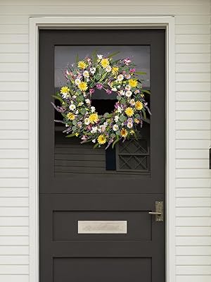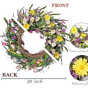 The Sggvecsy Daisy and Lavender Wreath is a 24-inch handcrafted artificial wreath featuring a durable natural grapevine base adorned with vibrant, lifelike silk wildflowers including daisies, lavender, and berries. Designed for versatile indoor and covered outdoor use, it offers long-lasting color and shape without maintenance, making it an ideal stylish accent for front doors, weddings, holidays, and farmhouse décor.