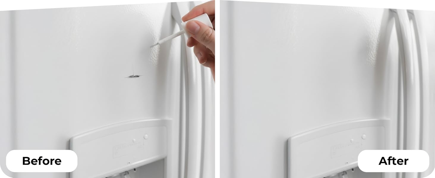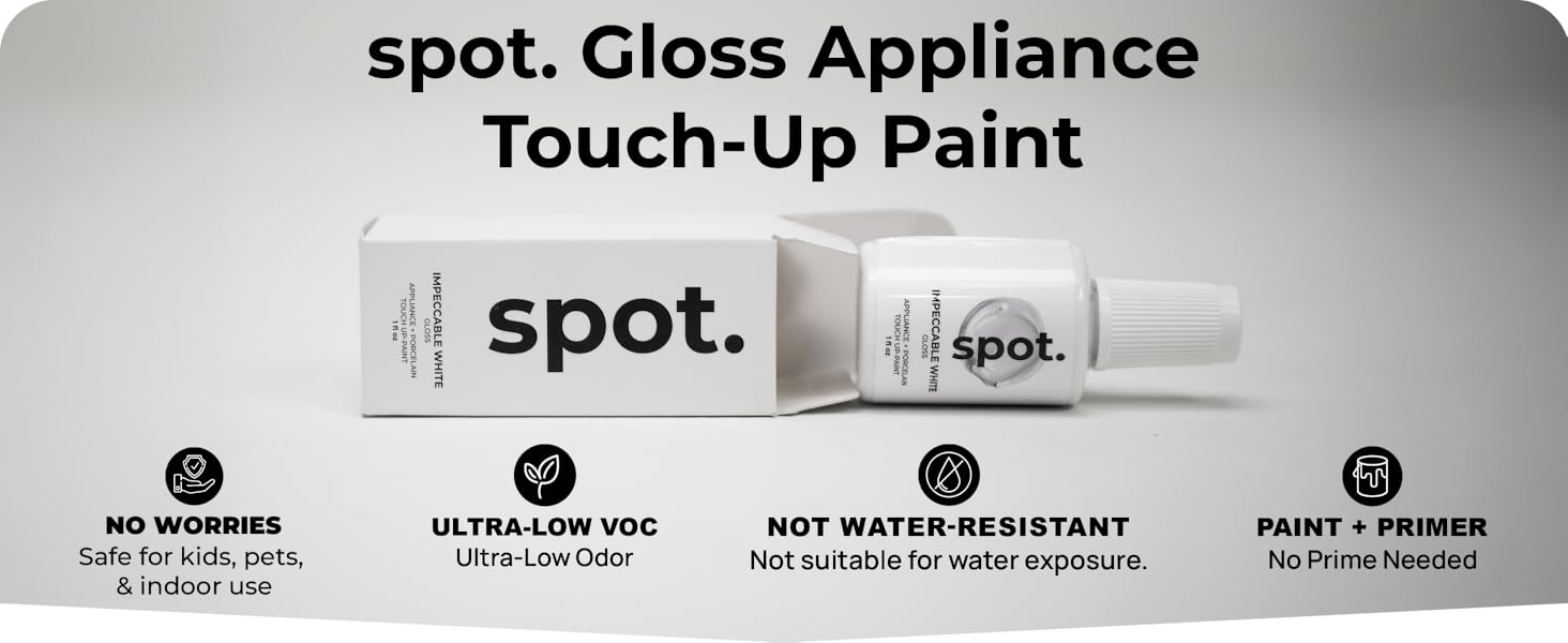 Spot. High-Gloss White Touch Up Paint is a fast-drying, water-based formula designed to repair chips, scratches, and cracks on white porcelain, ceramic, enamel, and metal surfaces. Featuring a precision fine-tip applicator, it delivers a durable, high-gloss finish that blends seamlessly without yellowing or flaking. Safe, odor-free, and ultra-low VOC, this compact 1 fl oz bottle covers up to 100 square feet, making it perfect for quick, mess-free appliance and surface touch-ups both indoors and outdoors.