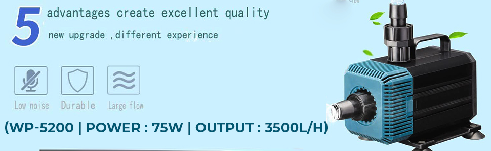 The VAYINATO Sobo WP-5200 is a 75W submersible water pump delivering up to 3500 liters per hour with a 2.5-meter lift height. Designed with a wear-resistant ceramic shaft and quiet operation, it fits any aquarium or pond via suction cups and supports both fresh and saltwater applications, making it a versatile and durable choice for professional aquatic setups.