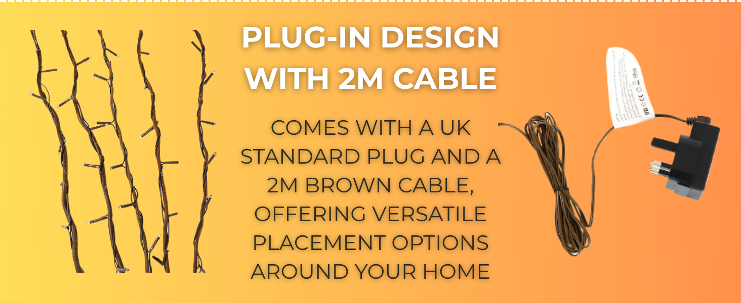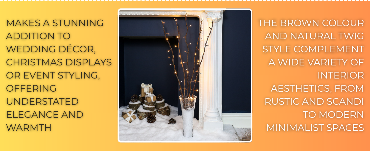 These Festive Lights feature 5 flexible brown willow twig branches, each 87cm tall, adorned with 50 warm white LEDs powered by a 2-meter plug-in cable. Designed for indoor use, they offer a natural, elegant glow that enhances any room’s ambiance without the hassle of batteries. Perfect for vases, tables, or decorative displays, they combine rustic aesthetics with modern convenience and come with a 12-month warranty for reliable, long-lasting performance.