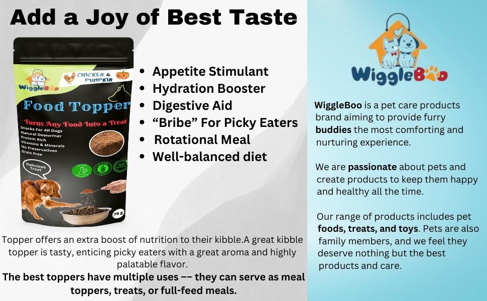 WiggleBoo’s Magical Dog Food Topper is a 70g grain-free powder blend of farm-fresh chicken and pumpkin designed to boost your dog’s appetite and nutrition. With over 70% high-quality protein, natural deworming properties, and omega-6 fatty acids, it supports lean muscle, bone health, and a shiny coat—perfect for all breeds and life stages.