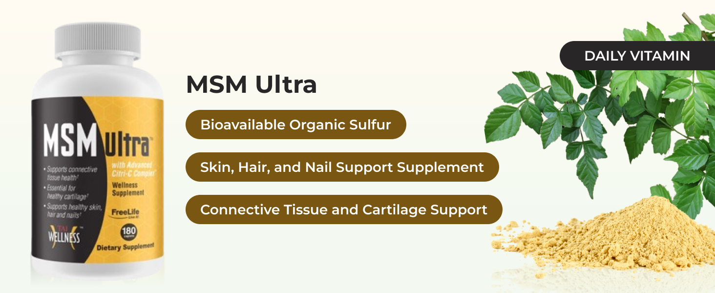 Youngevity Freelife MSM Ultra delivers 1500 mg of bioavailable organic sulfur per caplet, essential for supporting immune, digestive, and respiratory health, while promoting healthy skin, hair, nails, joints, and cartilage. This additive-free supplement is tailored for adults seeking comprehensive wellness and vitality.