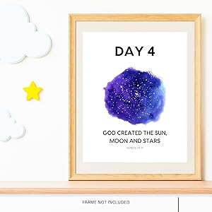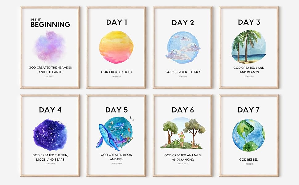 This set of 8 unframed 8"x10" posters beautifully illustrates the 7 days of creation, making it an ideal educational tool for Sunday School and children's rooms. Printed on premium gloss paper, these artistic designs are perfect for enhancing any space while supporting a local family business.