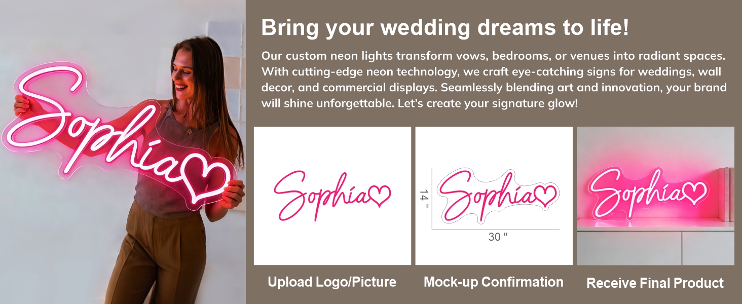 Custom Neon Signs offer a fully personalized LED experience with over 10 colors, 20 fonts, and multiple backboard shapes. Featuring high-quality flexible silicone LED strips, remote dimming with 8 brightness levels, and 10 flashing modes, these signs are safe, durable, and perfect for weddings, home decor, or business branding. Easy to install and designed to create a warm, vibrant atmosphere that elevates any space.