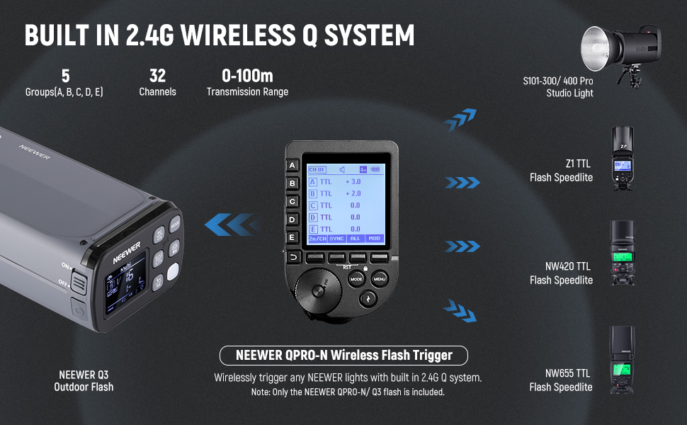 NEEWER Q3 200Ws 2.4G TTL Flash (2nd Version), 1/8000 HSS Strobe Light Photography Monolight with QPRO-N Trigger Compatible with Nikon, Diffuser/3200mAh Battery/500 Full Power Pops/Recycle in 0.01-1.8s