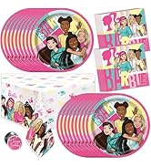 This officially licensed Barbie Birthday Party Decorations kit serves 16 guests with a coordinated set including 9 balloons, a Happy Birthday banner, a leakproof 54" x 84" tablecover, 32 heavy-duty paper plates, napkins, forks, and a birthday button—designed for quick setup and a visually stunning, hassle-free celebration.