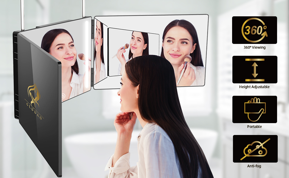 The GLDDAO Three Way Mirror is a modern, wall-mountable trifold mirror featuring a 360-degree viewing angle and built-in LED lights. Crafted from durable ABS and glass, it offers a sleek black finish and 5x magnification for detailed grooming. Designed for self haircuts, braiding, shaving, and makeup, this versatile mirror empowers you to master your personal style with professional-level precision at home.