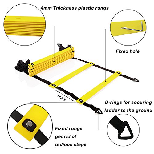 A MUST HAVE FOR ATHLETES VST Agility Ladder is an excellent tool to keep your body and your mind actively moving. It is scientifically proven to improve foot speed, lateral quickness, agility, coordination, and overall balance. It is perfect for athletic training, warm-ups, cool-downs, soccer, football, basketball drills, hockey, lacrosse, tennis, badminton, rugby, and more. BEST SPEED TRAINING EQUIPMENT Made of heavy duty plastic rungs and durable nylon straps, this Agility ladder is suitable for any high-intensity training. The adjustable nylon straps allow you to adjust flat rungs at any distance for your safety and preferences. FUNCTION: - 12 rungs agility ladder with evenly-spaced fixed rungs - Improve acceleration, lateral speed, flexibility, balance and body control - Space between rungs measures 20 inches wide and 17 inches long - Sidebars are made of durable nylon straps - Enhance agility ladder leg muscles, ankle and knee function of the small muscles - Reducing the probability of lower limb injury PACKAGE INCLUDES£º 10 x Cones 4 x Metal PEGS 1 x Agility Ladder 1 x Product manual 1 x Black Carrying bag MAKE A MOVE WITH VST AGILITY LADDER FOR MORE CHALLENGING WORKOUT!
