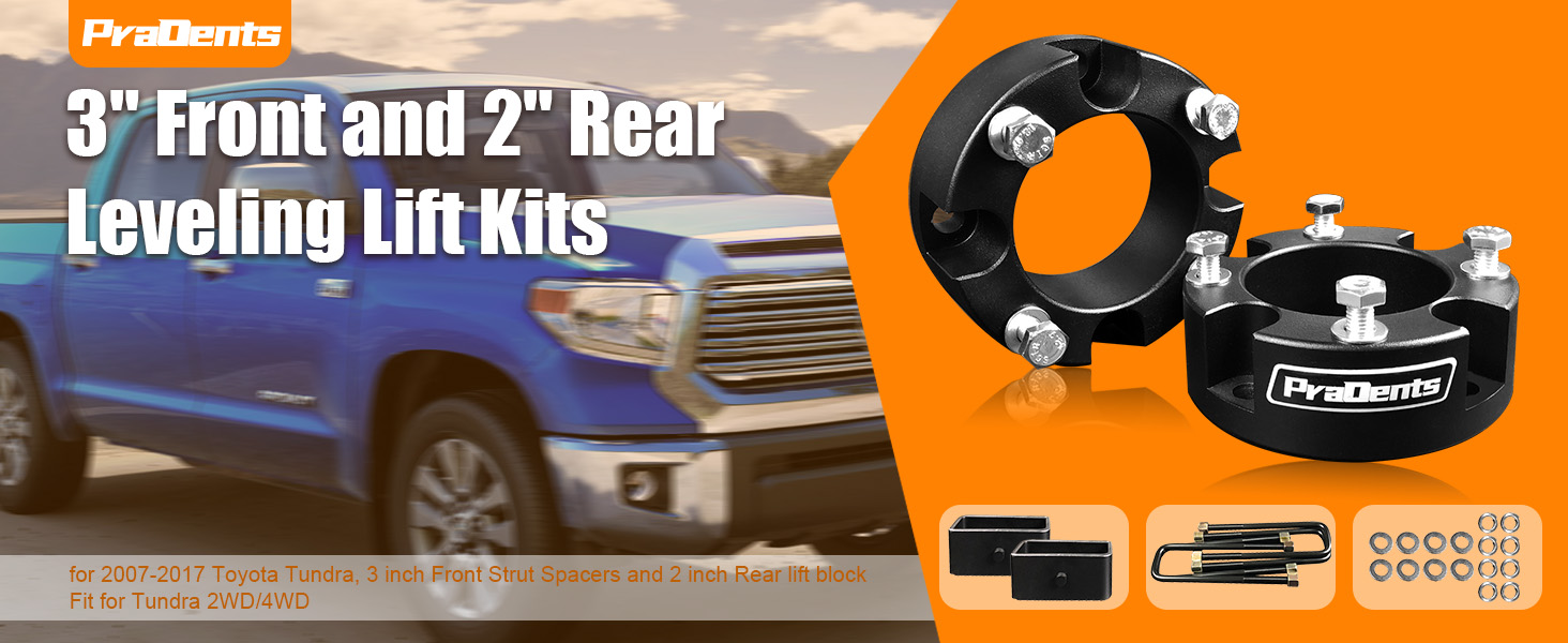This PraOents leveling lift kit offers a 3-inch front and 2-inch rear suspension lift specifically designed for 2007-2017 Toyota Tundra models. Made from durable alloy steel, it enhances ground clearance and vehicle stance while ensuring precise fitment and easy installation. The kit includes a 2-year free parts replacement warranty, combining rugged performance with peace of mind.