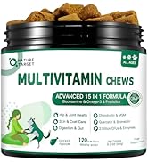 NATURE TARGET Multivitamin for Dogs delivers a scientifically formulated 15-in-1 blend of 17 essential vitamins, minerals, probiotics, and joint-supporting ingredients like glucosamine and MSM. Designed to enhance joint mobility, digestive health, skin, and coat vitality, these chicken-flavored soft chews come vacuum-packed for freshness and are free from common allergens. Perfect for dogs of all sizes, this premium supplement supports overall wellness with high potency and clean, natural ingredients.