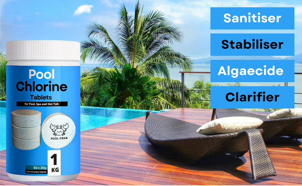 Pool Crab Chlorine Tablets are a premium 4-in-1 solution designed to sanitize, stabilize, clarify, and prevent algae growth in your pool, spa, or hot tub. Each 1kg pack contains 50 slow-release tablets that last up to a week, ensuring crystal clear water while being compatible with all pool types. Enjoy peace of mind with our satisfaction guarantee!
