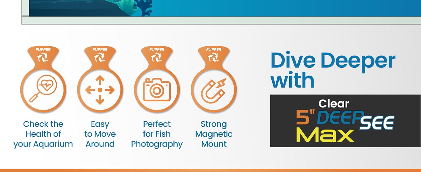The FL!PPER DeepSee Viewer MAX features a premium 5-inch optical lens with a magnetic clip-on design compatible with glass and acrylic tanks up to 5/8" thick. Engineered for both freshwater and saltwater aquariums, it offers an ideal 8-12 inch focal range to elevate your aquarium photography and videography, delivering unparalleled clarity and vibrant detail for all tank sizes.