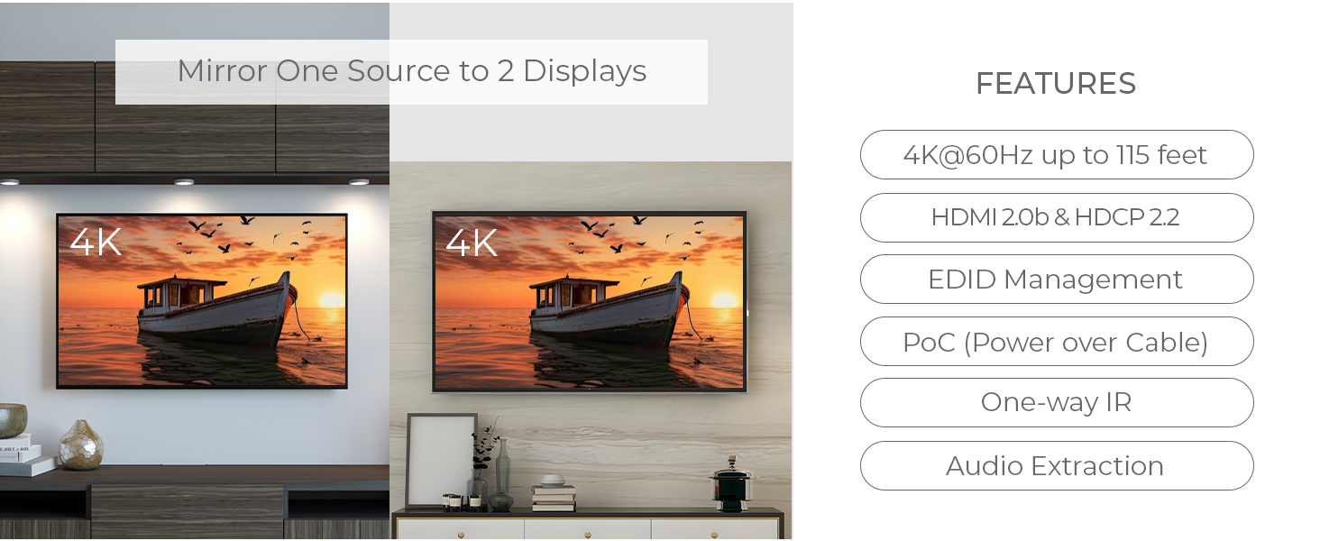 1x2 HDMI Extender Splitter 4K by Multiple Over Single Cable CAT6/7 4K@60Hz 4:4:4 HDCP 2.2 with IR Remote EDID Management - Up to 115 Ft - Loop Out - Low Latency - Full Support