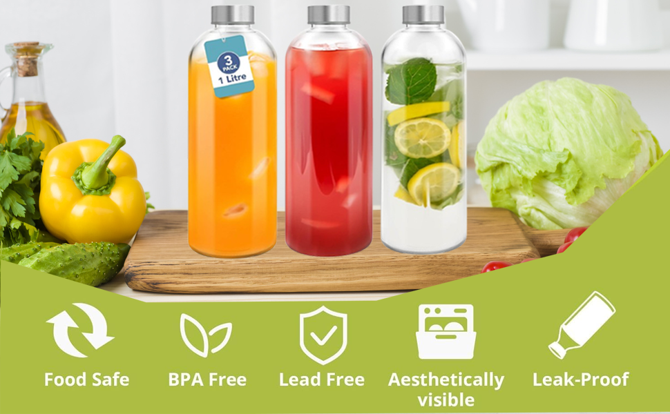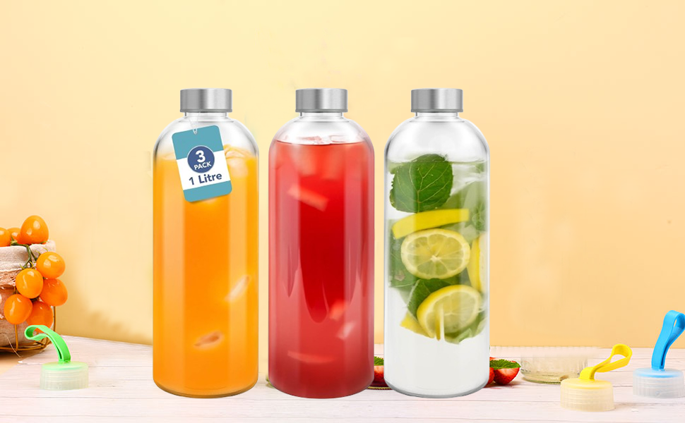 This 3-pack of 32oz (1L) clear glass bottles features thick, BPA- and lead-free glass paired with airtight stainless steel lids for leak-proof storage. Designed for hot and cold beverages like juices, smoothies, tea, and more, their wide-mouth design allows easy pouring and cleaning. Perfectly sized to fit car cup holders and dishwasher safe, these reusable bottles combine eco-friendly durability with everyday convenience.