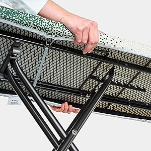 The Brabantia Ironing Board B offers a perfect blend of spacious 124x38 cm surface area and ergonomic height adjustability (69-96 cm), crafted with a durable steel frame and premium 100% Fairtrade cotton cover with foam padding. Designed for safety with non-slip feet and child lock, it folds compactly with a transport lock for easy storage. Certified Cradle-to-Cradle Silver, it’s an eco-conscious choice for stylish, efficient ironing.