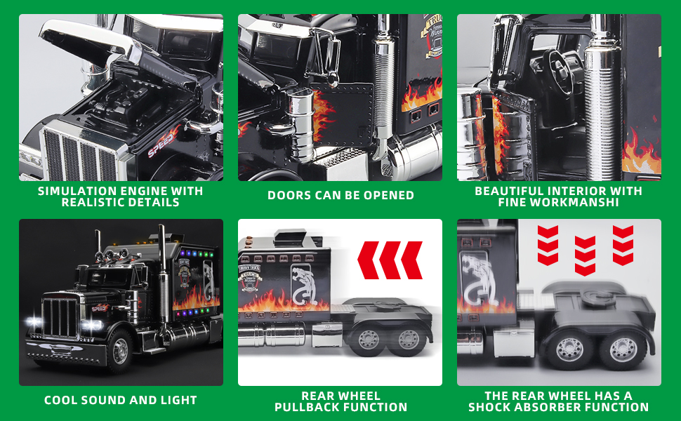 This 1:24 scale semi truck toy combines durable zinc alloy diecast construction with interactive sound and light effects, realistic detailing, and functional features like openable doors and pull-back action. Designed for kids aged 4-7, it doubles as a collectible model and educational tool to boost hands-on skills and imagination.