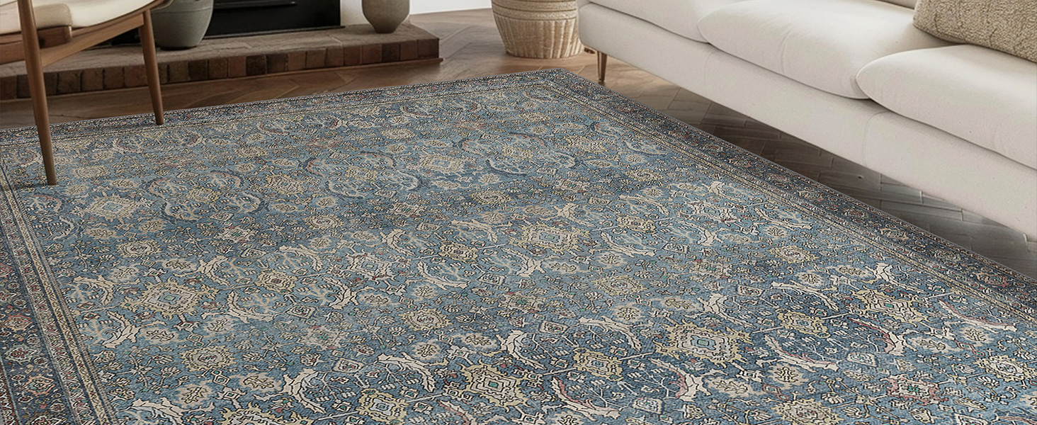 This 8x10 vintage blue area rug features a low pile, non-slip backing, and is fully machine washable, making it an ideal blend of style, safety, and convenience for dynamic living spaces with kids and pets.