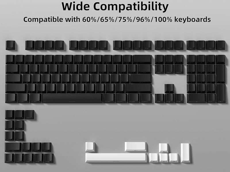 The dagaladoo Black/White keycaps set features 131 durable PBT double-shot keycaps with side-printed legends that shine through RGB lighting. Designed in ergonomic Cherry profile, these keycaps fit most MX-compatible mechanical keyboards, offering a premium, oil-resistant texture and long-lasting legend clarity for professionals and enthusiasts alike.