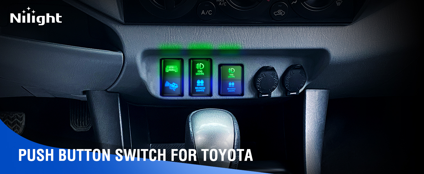 The Nilight Dual Push Button Switch is a precision-engineered 12V ON/OFF switch designed for simultaneous control of fog and reverse lights. Featuring a compact 1.28" x 0.87" panel mount size, it fits OEM blanks in Toyota models like Sequoia, Highlander, Tacoma, and more. With a 3 amp rating, copper contacts, and built-in LED illumination, this switch offers reliable, illuminated control for enhanced driving safety and style.