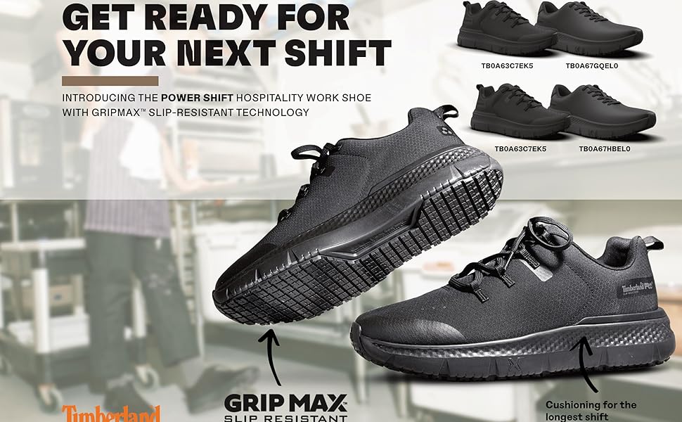Designed to help provide comfort in industrial environments, our Timberland PRO Power Shift work sneakers help offer a whole new level of performance. Their metal- and mutilation-free, durable yet breathable, ripstop nylon uppers have been treated with a 3M Scotchgard fabric protector to help repel liquids and block stains on and off the clock. We added our unique Timberland PRO 24/7 Comfort System that meets rigorous worksite demands while helping reduce foot fatigue by helping support your arch and cushioning every step, flexible cement construction, and lightweight Hover Spring foam midsoles designed for even more comfort, durability, and flexibility. Finally, our unique GripMax rubber outsoles help provide slip resistance by channeling away liquids such as oil, grease, and water for underfoot performance.