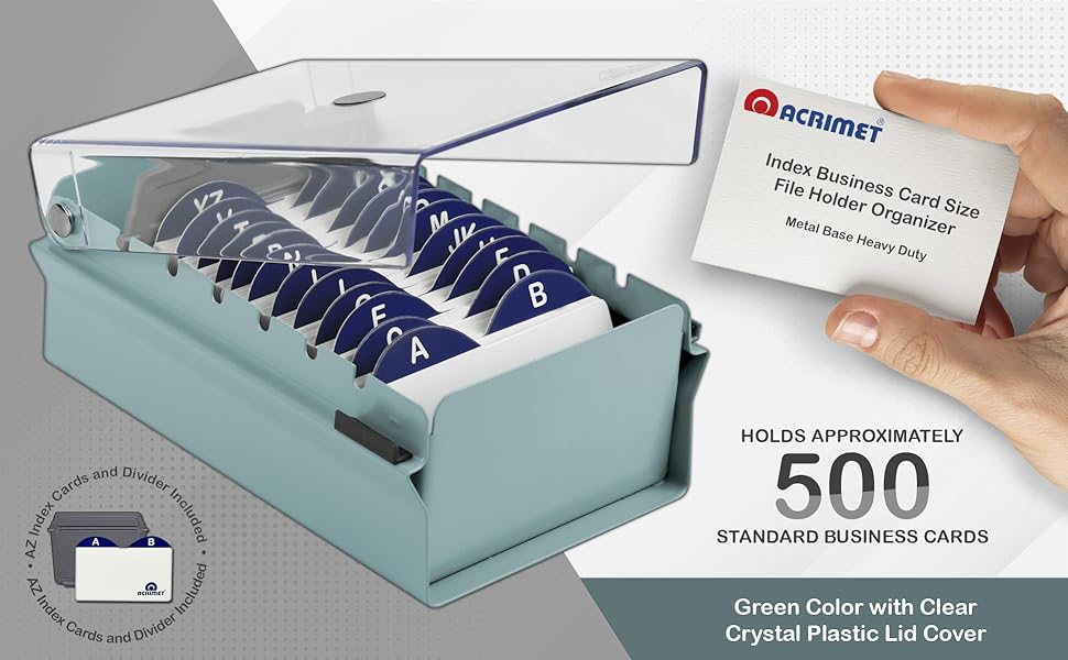 The AcrimetIndex Business Card File Holder combines a durable steel base with a clear plastic lid, offering secure storage for up to 500 business cards. Featuring included AZ index cards and a plastic divider, it streamlines organization and retrieval. Anti-slip pads ensure stability on any surface, while its sleek green finish and transparent cover bring a professional, modern touch to your office.