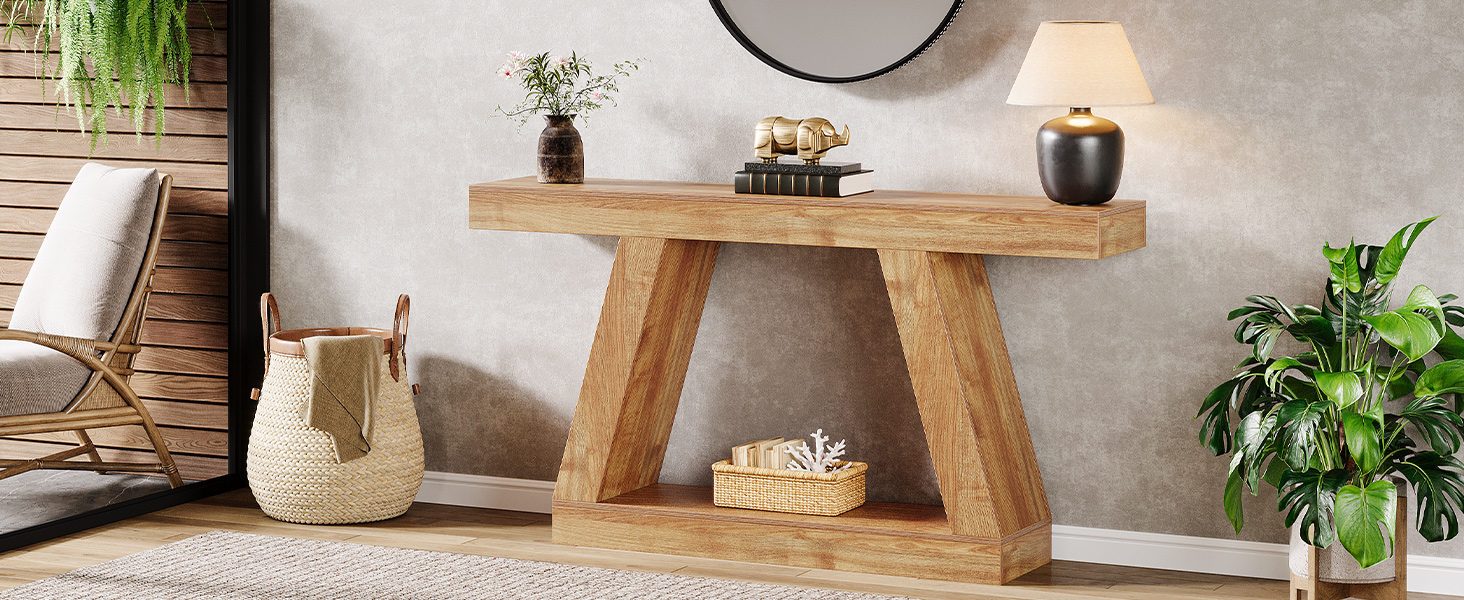 The Tribesigns Farmhouse Console Table is a 55-inch engineered wood sofa table featuring a natural brown rustic finish. Designed for durability, it supports up to 330 lbs and offers ample storage to keep your living space organized. Its versatile design fits perfectly in entryways, living rooms, or behind sofas, combining vintage farmhouse aesthetics with practical modern functionality. Easy to assemble with included hardware and backed by a 1-year warranty and lifetime customer service.