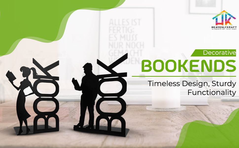 HeavenlyKraft Decorative Bookends are a pair of powder-coated black metal book stoppers measuring 7 x 4.72 x 3.9 inches each. Designed for durability and stability, their non-skid base keeps books securely in place while adding a sleek, modern touch to any home or office décor.